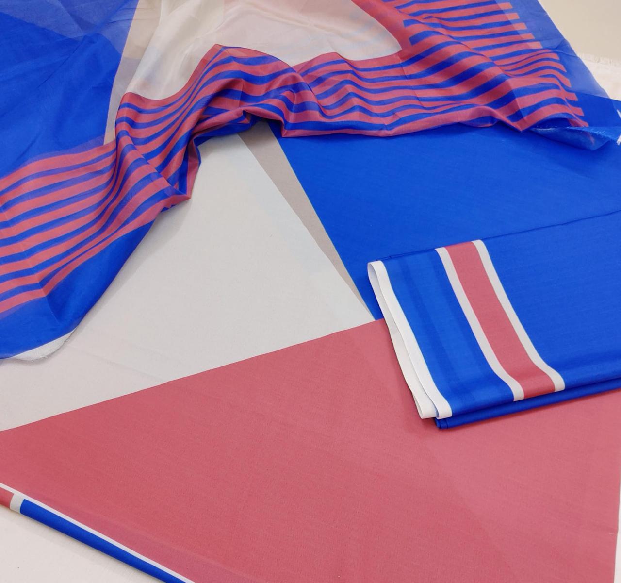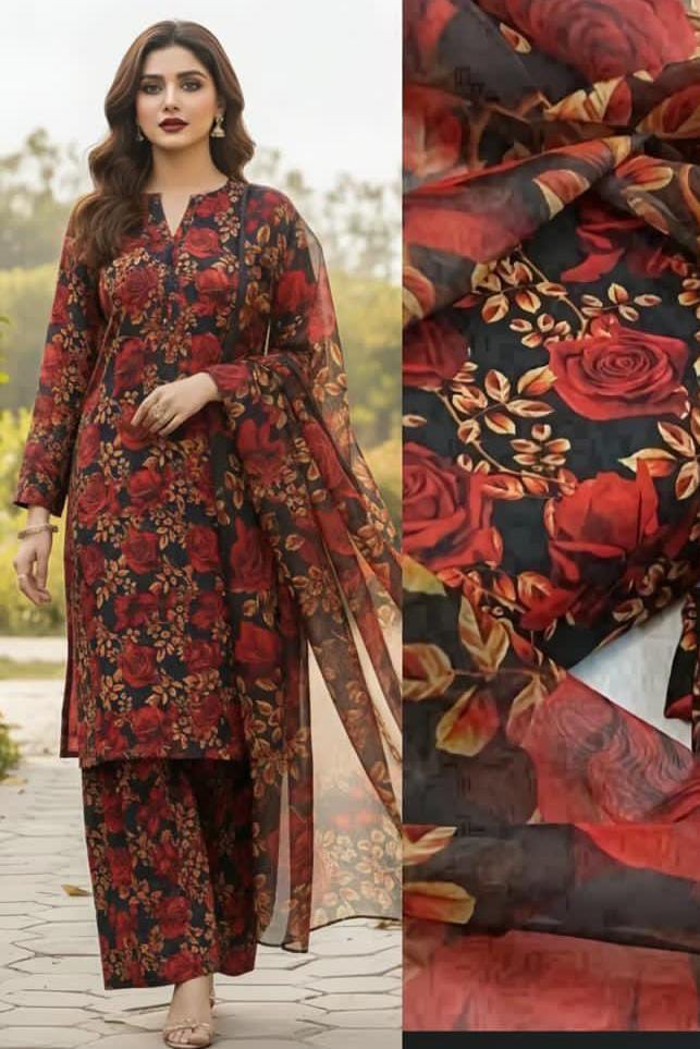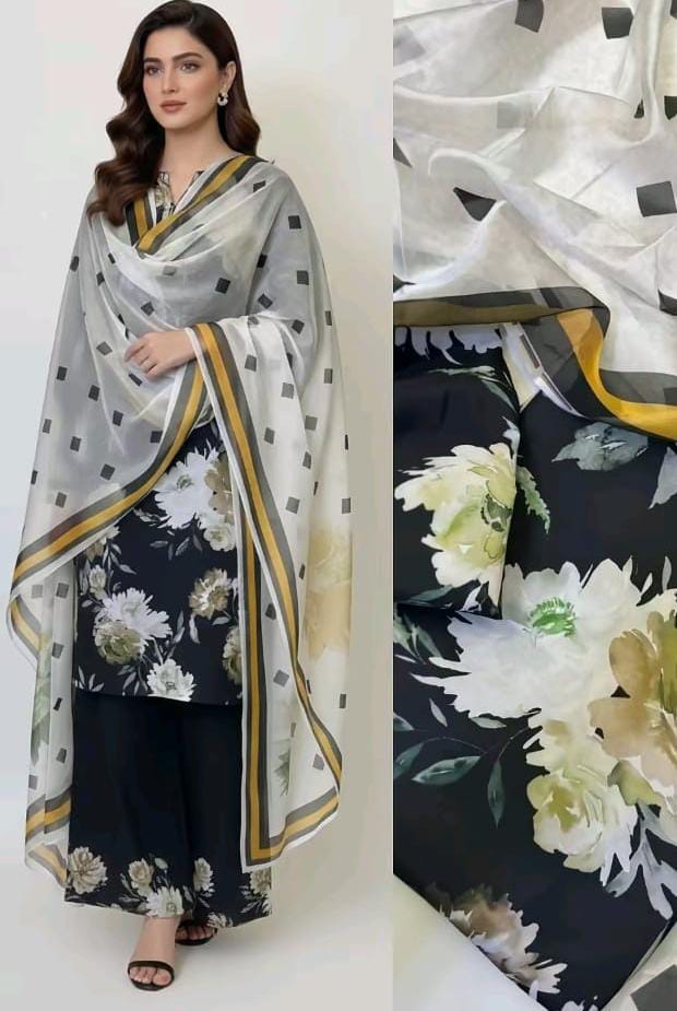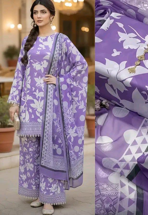 3PC Unstitched Swiss Lawn Suit – Digital Printed Shirt & Trouser with Silk Printed Dupatta (Trending Design)